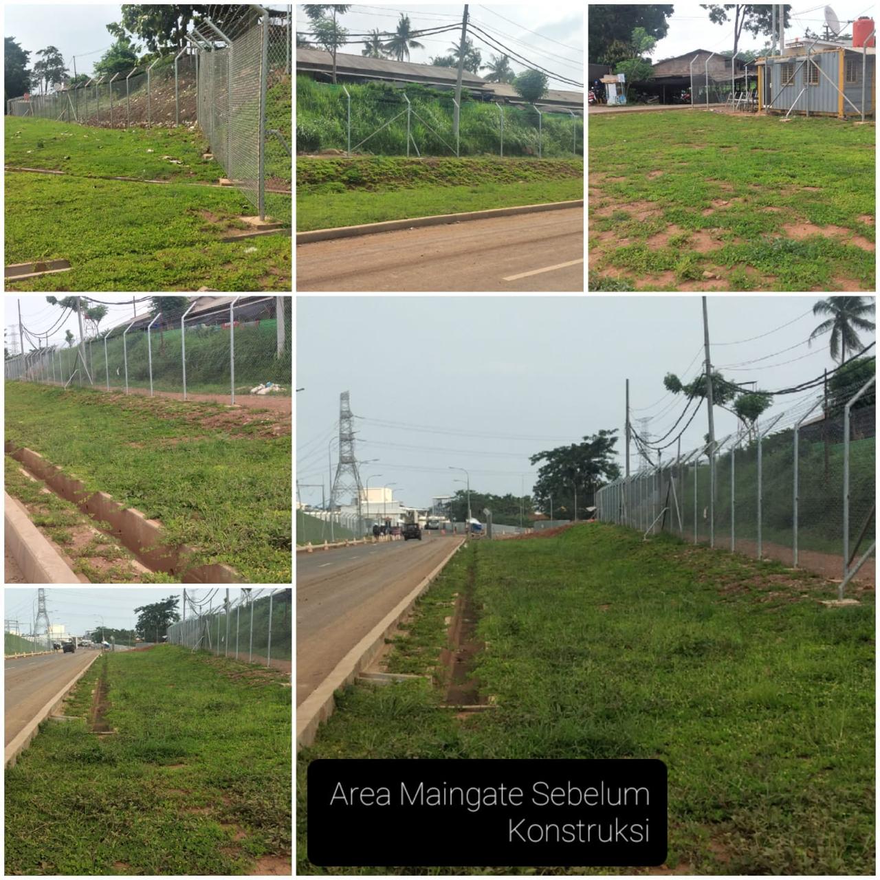 Tanaman dan elemen hijau pun belum terintegrasi dalam desain awal, membuat area ini tampak kosong dan kurang menarik secara visual. Pencahayaan yang tersedia hanya minimal dan tidak memadai, terutama di malam hari, yang membuat area ini terlihat redup dan kurang aman. Secara keseluruhan, area *Maingate* sebelum konstruksi belum mampu memberikan kesan profesional atau menyambut bagi pengunjung, dan lebih terlihat sebagai ruang transisi tanpa karakter yang menonjol.